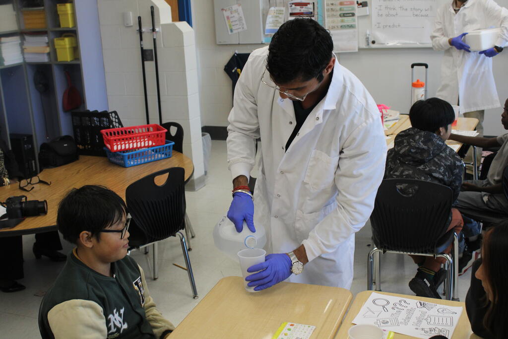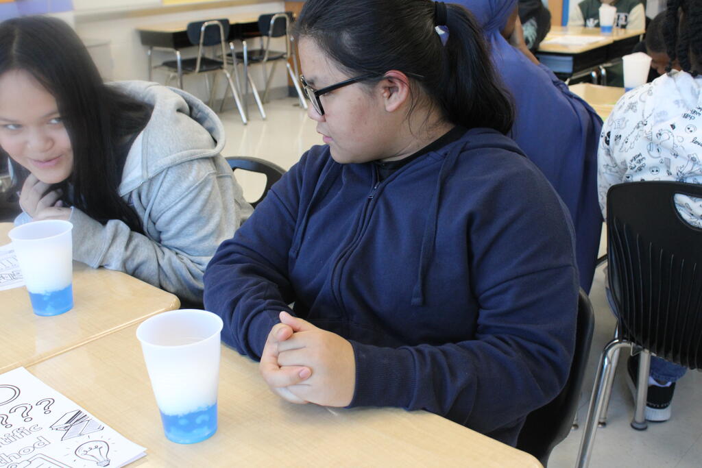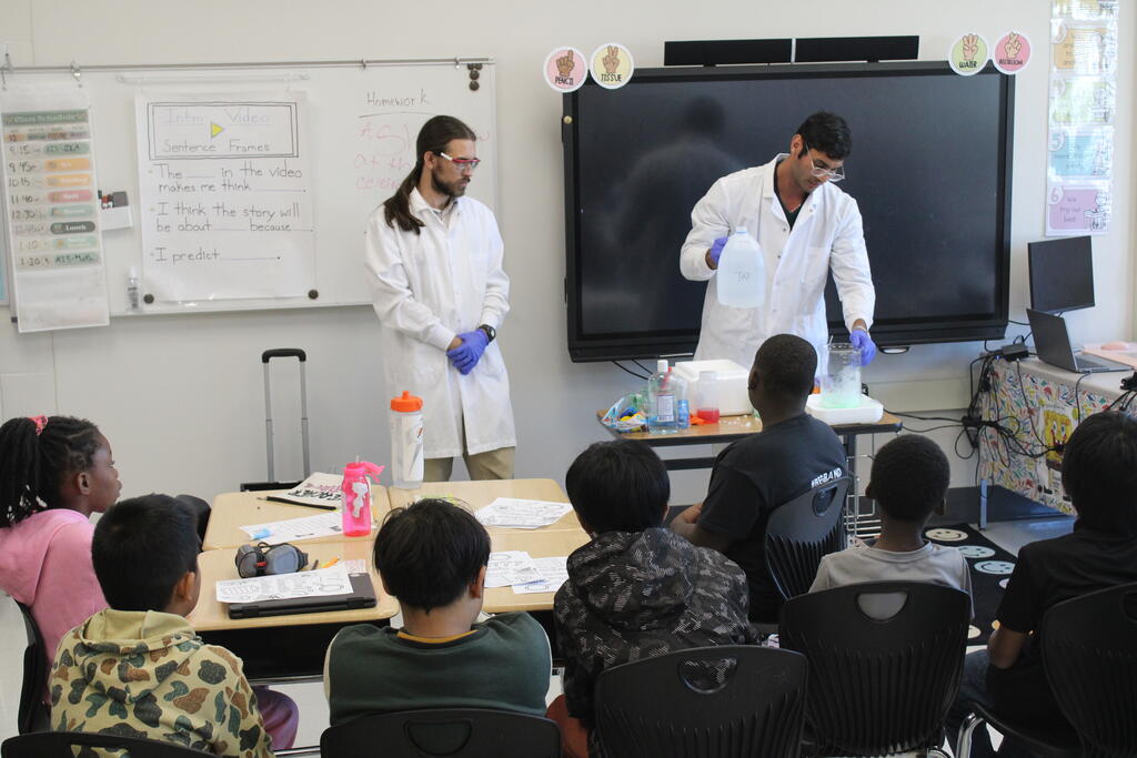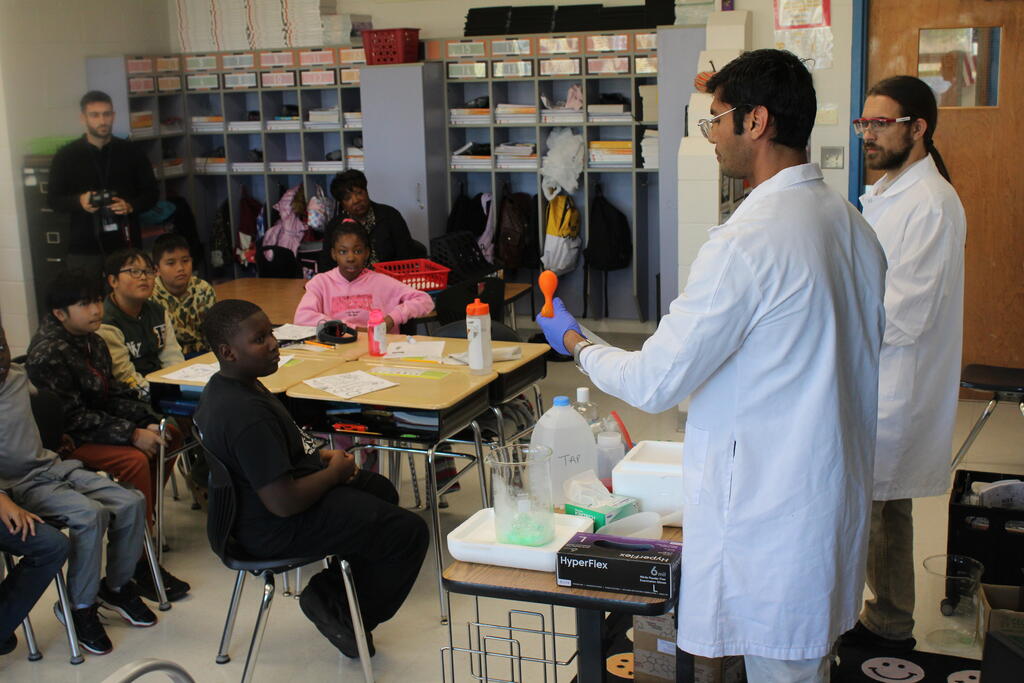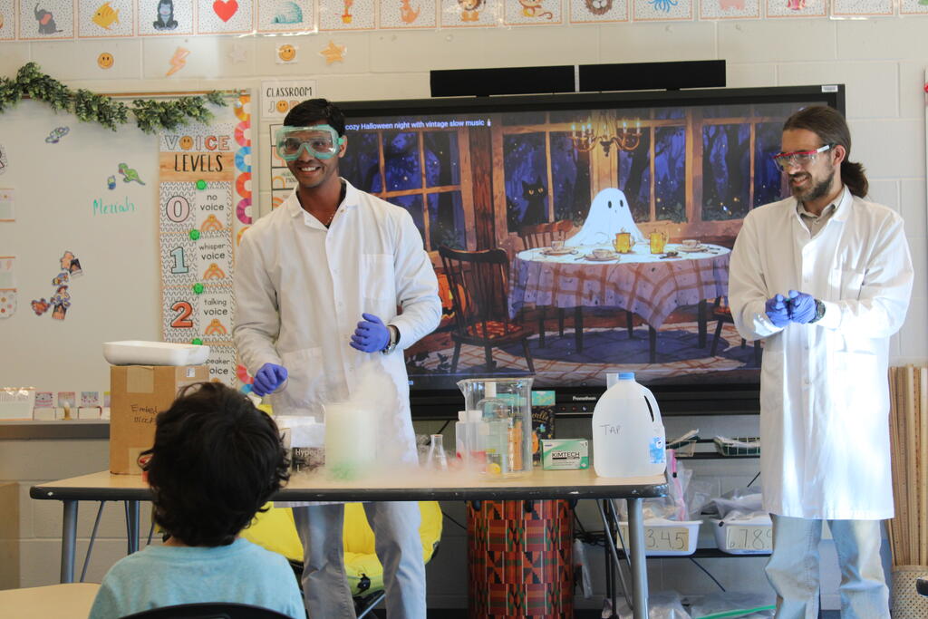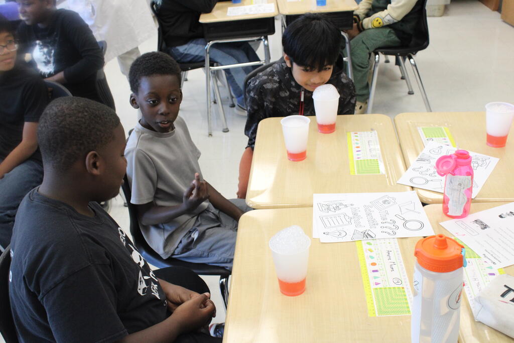 Masonic Medical Research Institute visits 6th grade classroom for a demonstration on dry ice reactions for National Chemistry Week. Students got a peek at experiments that change the color of liquids and create bubbles.